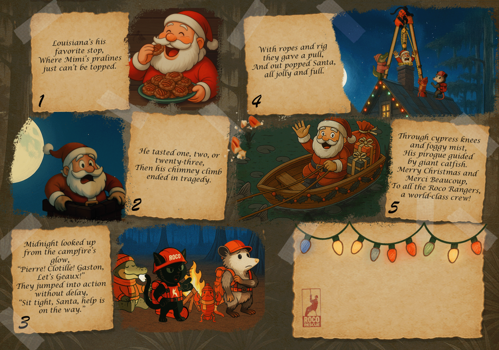 This year’s card brought something new. It marks the first appearance of Midnight the Rescue Cat, inspired by Ms. Kay’s beloved black cat. Midnight is joined by a team of Cajun characters who feel right at home in our world. Gaston the Gator, Clotilde the Crawfish, and Pierre the Possum all step in as the Roco Rangers.